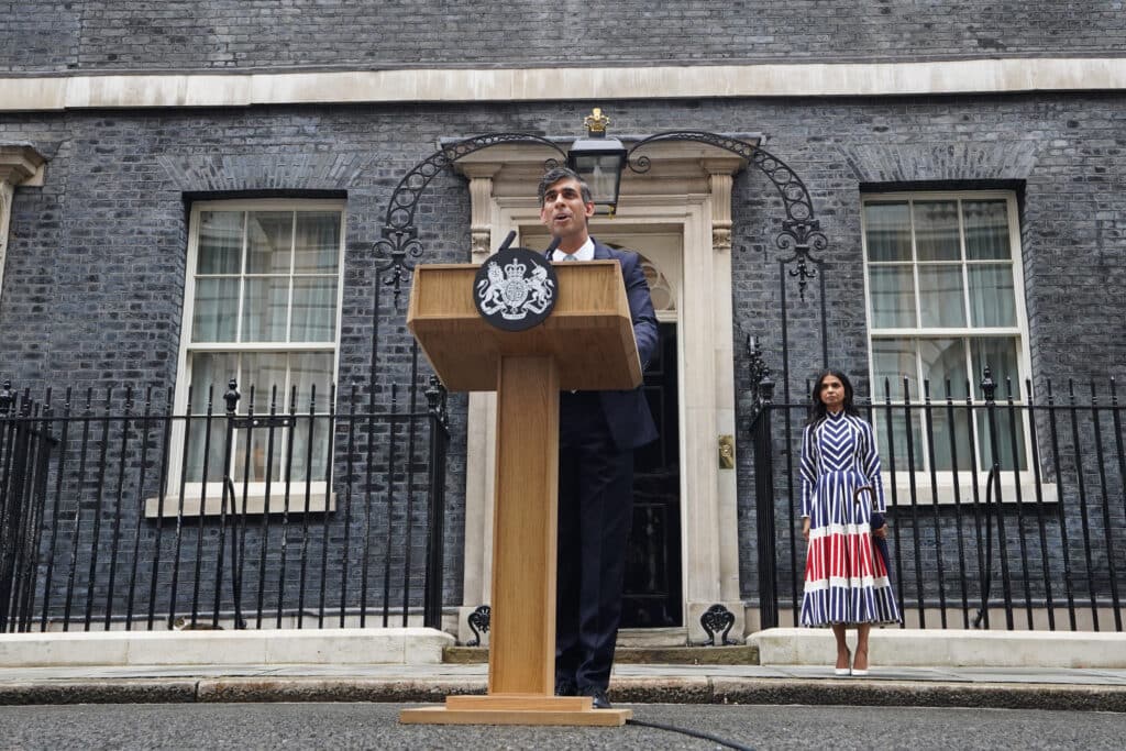Akshata Murty, the wife of outgoing Conservative Prime Minister Rishi Sunak, stands and listens, as he gives a speech in Downing Street, London, following his party’s landslide defeat to the Labour Party in the 2024 General Election. Picture: PA