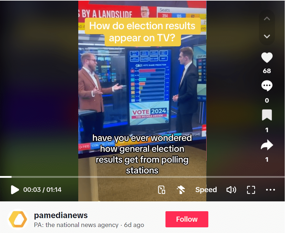 A TikTok from the PA Media TikTok profile explaining how PA get the election night results to viewer’s screens.